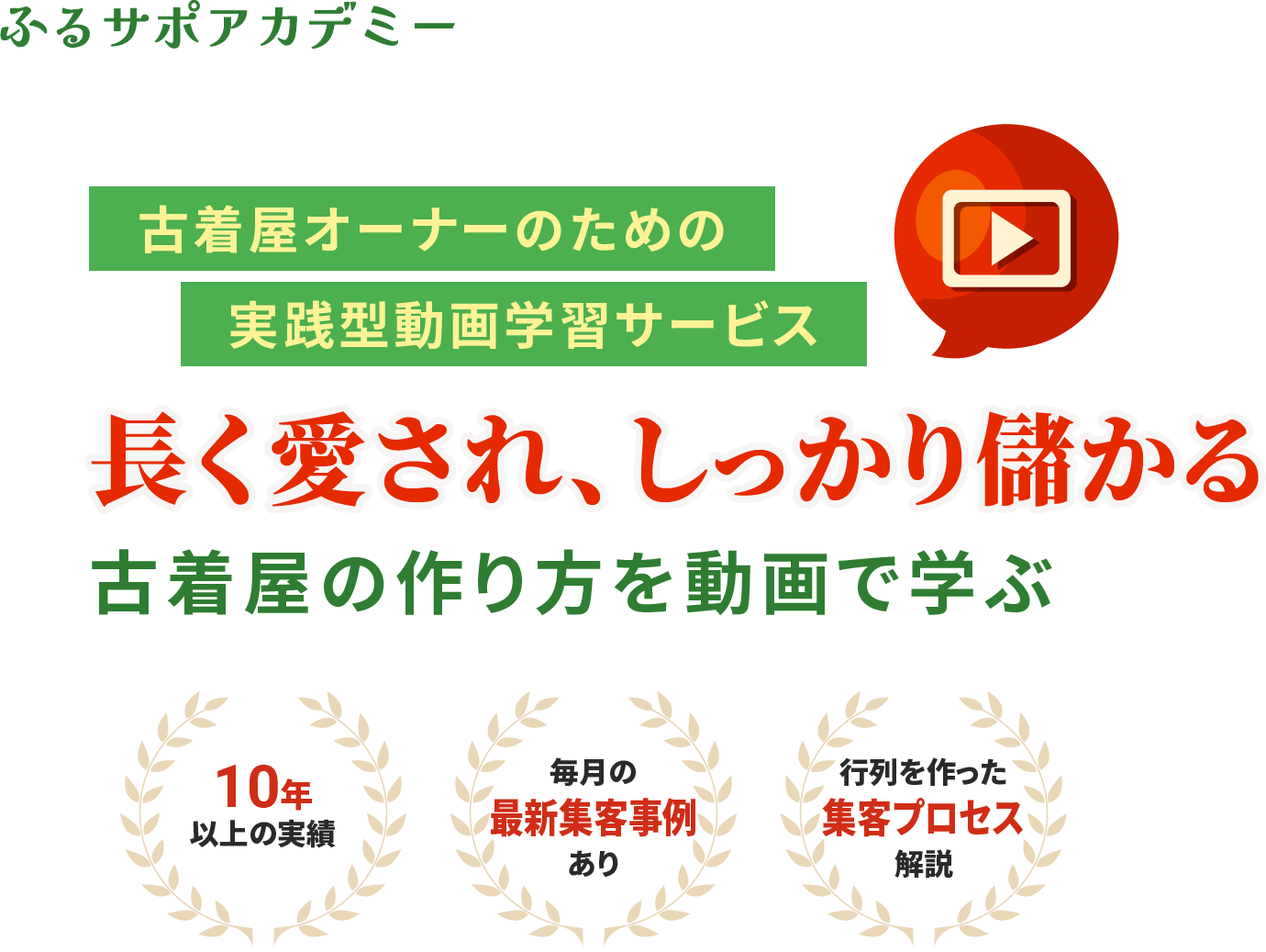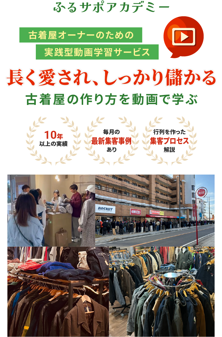 ふるサポアカデミーでは、現役古着屋オーナーが0から古着屋を立ち上げ、10年常に仮説検証を繰り返し、確立した古着屋を成功させるために必要な知識と現場で使えるノウハウを集約。『長く愛され』『しっかり儲かる』古着屋の作り方が学べます。