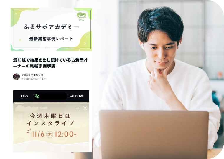 独学では、壁にぶつかった瞬間に止まってしまいます。 「支払いがしんどい」「SNSで集客できない」といったあなたの店のリアルな悩みも最新事例を解説する「ふるサポアカデミー限定レポート」や、「古着屋運営相談会」「交流会」での質問・共有を通じて、解決のヒントを得られます。もう一人で頭を抱える必要はありません。