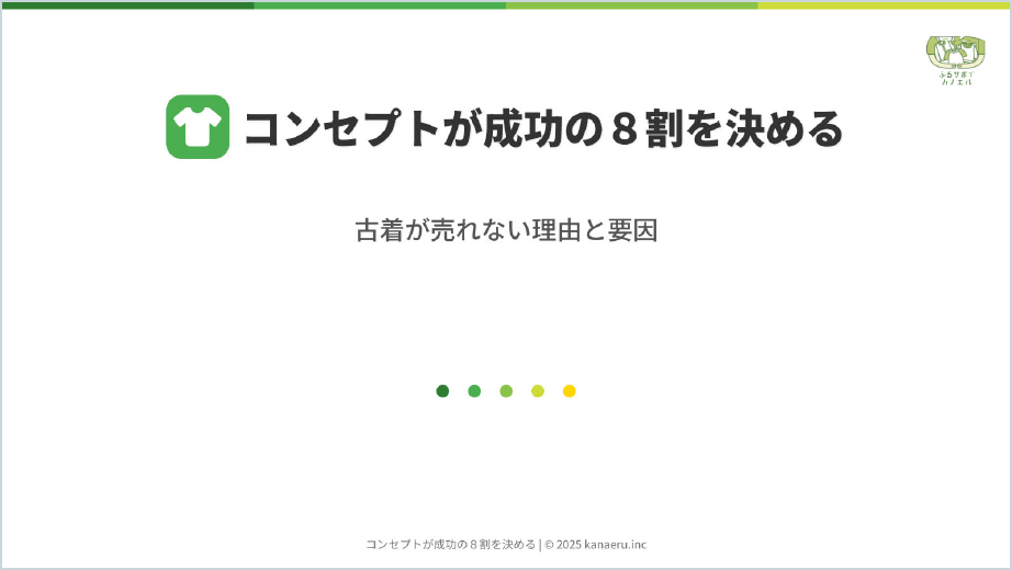 動画教材は「いつでも・どこでも」学習可能ですが、あえて「毎月順次公開」の仕組みを設けています。詰め込み学習で「勉強した気」になるのを防ぎ、「インプット→即実践」のサイクルを確実に回すためです。 更新期間以降は好きなタイミングで続けても、退会しても構いません。ふるサポアカデミーは「オンラインサロン」ではなく、成果に直結する「古着屋オーナーのための教育カリキュラム」です。
