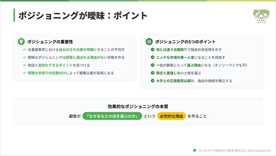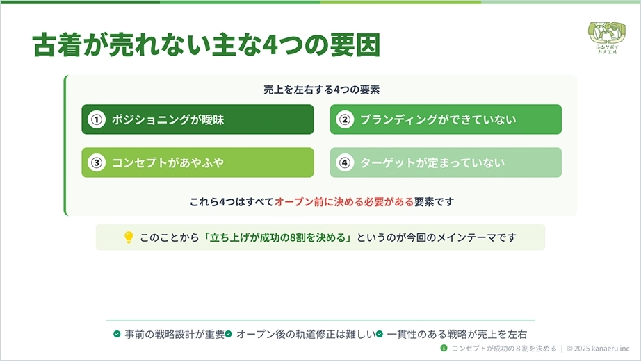 「何をしていいかわからない」「売上の原因がわからない」…その迷いは、成功までの「地図」がないからです。ふるサポアカデミーでは、現役オーナーが10年の失敗と検証で確立した「古着屋運営の答え」を100本以上の動画で完全網羅。【集客】【仕入れ】【ブランド戦略】【経営力】…あなたが今やるべきことが、全て明確になります。