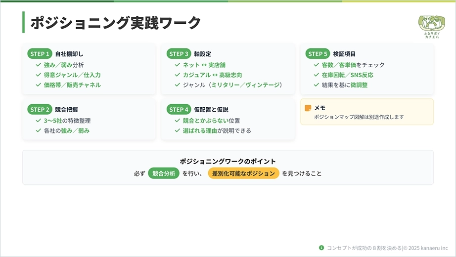 市場リサーチ、競合分析、事業計画、集客導線の設計など「古着屋の実務」を前提にした課題を用意しています。