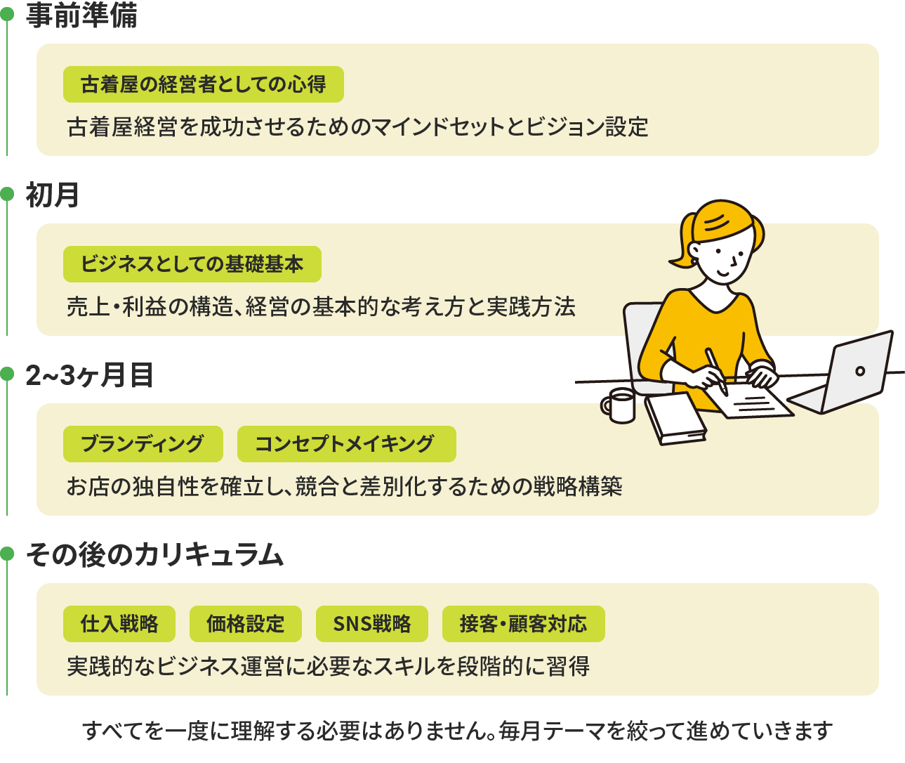 古着屋オーナーとして開業までに必要な知識を無理なく習得し、万全の準備でスタートダッシュができる体制を目指します。